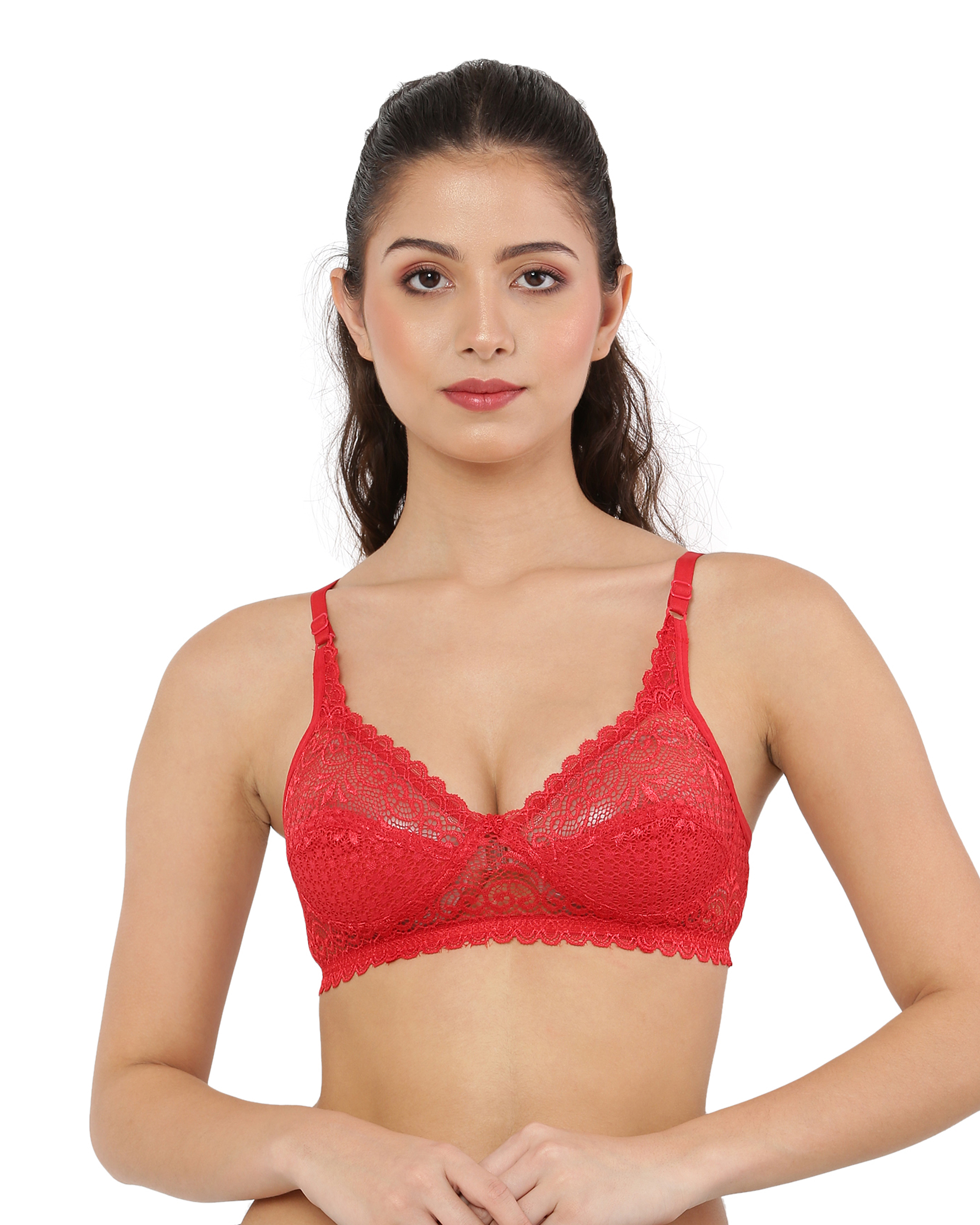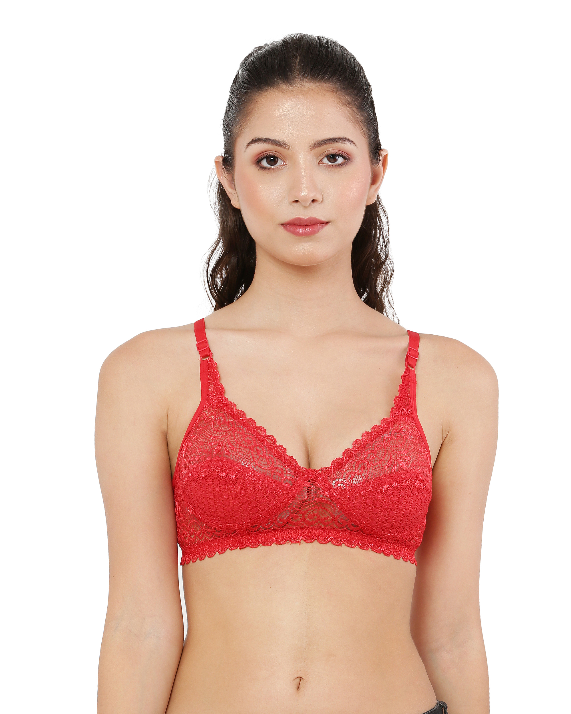 Elegant and breathable, this red net bra features a stylish lace design, full coverage, non-padded cups for a natural fit, regular straps, and a back closure, making it perfect for everyday wear or special occasions.